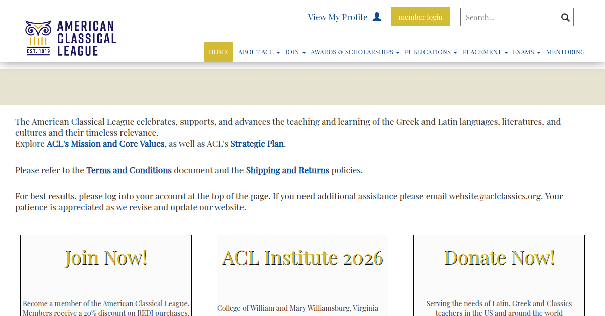 The American Classical League supports and advances the teaching and learning of Greek and Latin languages, literatures, and cultures. They offer resources, exams, webinars, and professional development for educators, promoting the timeless relevance of classical studies. Members receive discounts on materials.