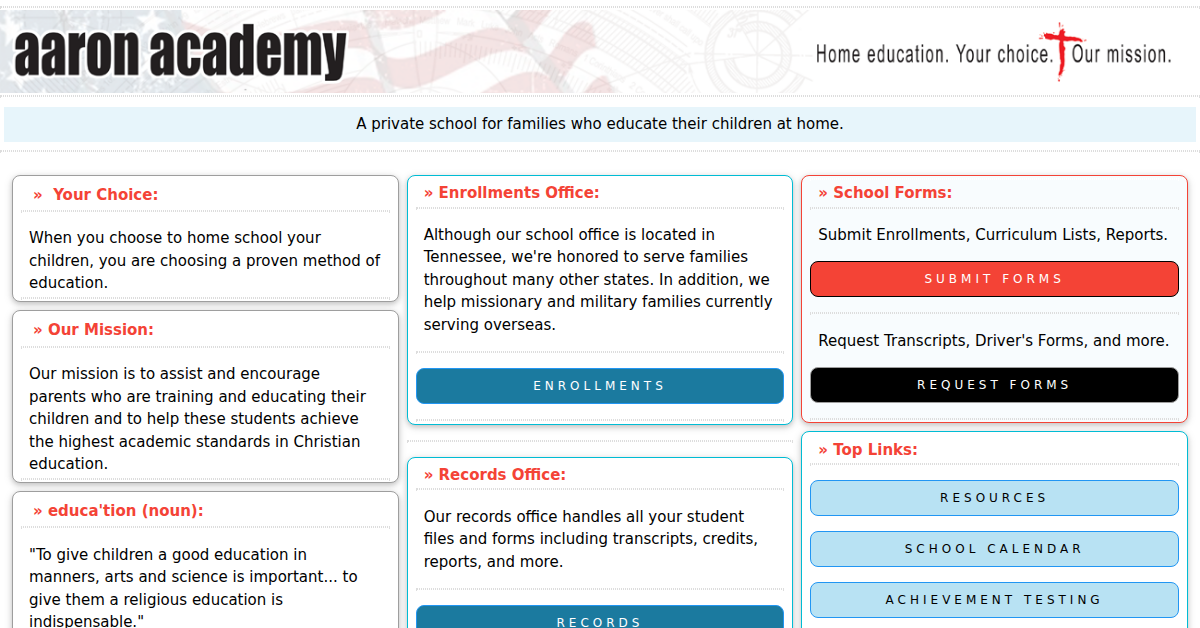 Aaron Academy is a Christian private school offering administrative support for homeschooling families. They provide essential services like enrollment, record-keeping, transcripts, and curriculum resources. Serving families across many states and overseas, they help students achieve high academic standards within a faith-based educational framework.