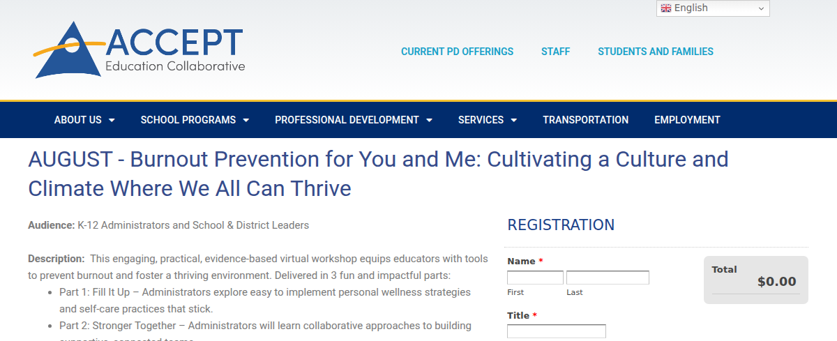 ACCEPT Education Collaborative provides individualized, evidence-based programs for students with academic, behavioral, and therapeutic needs, including IEP-driven specialized services. They offer school programs for Early Childhood, Kindergarten, Elementary, Middle School, High School, extended school year programs, and transition programs for young adults aged 18-22. Additionally, ACCEPT offers professional development for educators and district services like consultation and home-based support.