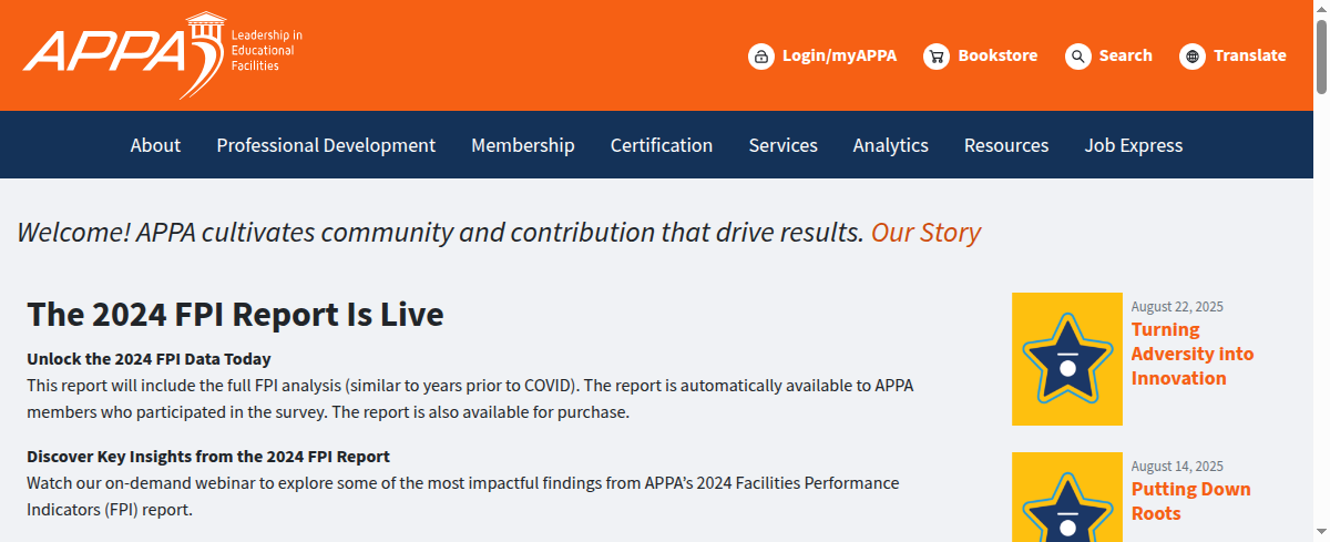 APPA empowers educational facilities professionals in Early Childhood, Kindergarten, Elementary, Middle School, High School and higher education through professional development, certifications, and operational guidelines. They provide resources for finance, budgeting, procurement, and facilities management, supporting data-driven decision-making for school, district, and campus leaders. Offerings include conferences, training, and benchmarking tools.