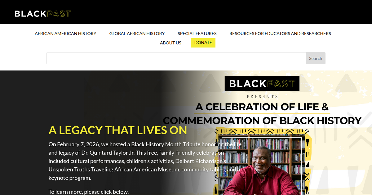 BlackPast.org is the world’s largest online encyclopedia dedicated to Black history, offering reliable articles on African American and Global African history. It provides a modern, user-friendly experience for students, educators, and families to explore people, places, events, and movements that shaped Black experiences. The site supports research, lesson planning, and deeper learning through well-organized topics and featured articles.