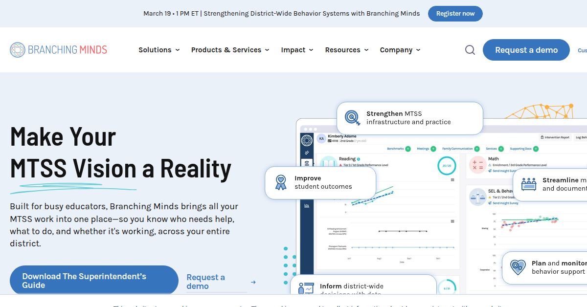 Branching Minds is dedicated to enhancing the efficiency and effectiveness of MTSS (Multi-Tiered System of Supports) and RTI (Response to Intervention) programs within school districts. Their core mission is to simplify the management of these programs, ensuring that educators can easily identify students in need of support, implement appropriate interventions, and assess their impact across the district. This organization primarily serves educators and school leaders who are tasked with addressing the diverse needs of students in a time-sensitive manner.