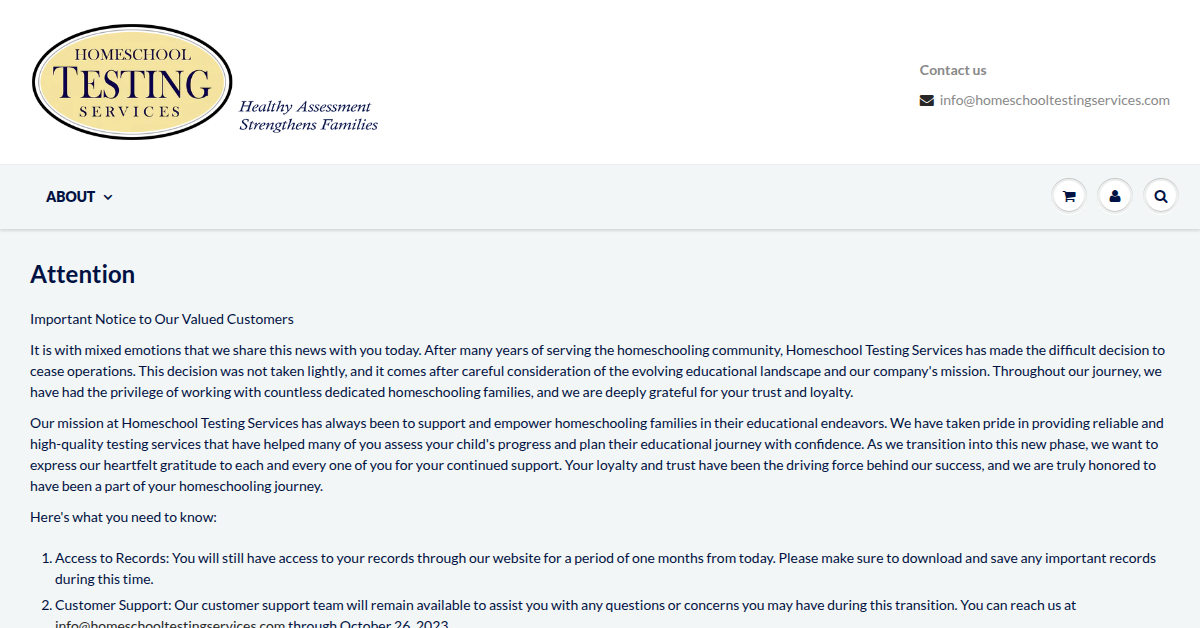 Homeschool Testing Services previously offered reliable, high-quality testing for homeschooling families to assess student progress and plan educational journeys. The company has ceased operations but provided access to records and customer support during a transition period, expressing gratitude for customer trust and loyalty.