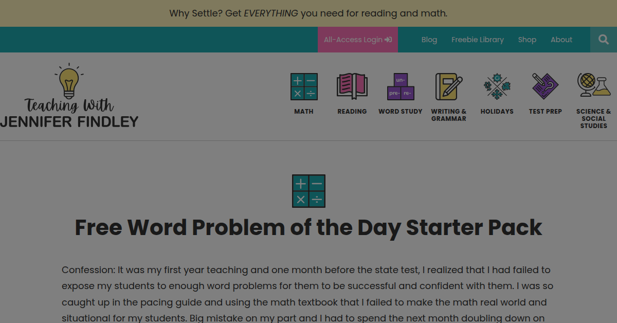 About Practical ideas and resources to inspire both you and your students – Teaching with Jennifer Findley: Join me in this three-part video series that will transform the way you view math centers and help you implement them into your 4th or 5th math instruction. Join me in this three-part video series that will transform the way you view math centers and help you implement them into your 4th or 5th math instruction. Welcome Friends! Im Jennifer Findley: a teacher, mother, and avid reader. I believe that with the right resources, mindset, and strategies, all students can achieve at high levels and learn to love learning. My goal is to provide resources and strategies to inspire you and help make this belief a reality for your students. Practical ideas and resources to inspire both you and your students – Teaching with Jennifer Findley Why Settle? GetEVERYTHINGyou need for reading and math. Welcome Friends! Im Jennifer Findley: a teacher, mother, and avid reader. I believe that with the right resources, mindset, and strategies, all students can achieve at high levels and learn to love learning. My goal is to provide resources and strategies to inspire you and help make this belief a reality for your students. Contact Me Learn More Welcome Friends! Im Jennifer Findley: a teacher, mother, and avid reader. I believe that with the right resources, mindset, and strategies, all students can achieve at high levels and learn to love learning. My goal is to provide resources and strategies to inspire you and help make this belief a reality for your students. Contact Me Learn More Welcome Friends! Im Jennifer Findley: a teacher, mother, and avid reader. I believe that with the right resources, mindset, and strategies, all students can achieve at high levels and learn to love learning. My goal is to provide resources and strategies to inspire you and help make this belief a reality for your students. Contact Me Learn More Welcome Friends! Im Jennifer Findley: a teacher, mother, and avid reader.