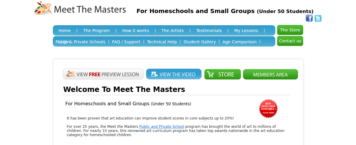 Meet The Masters provides award-winning art education curriculum for homeschoolers, charter schools, and small groups. Their program helps students learn art history and techniques through online slideshows, worksheets, and hands-on art creation. No prior art background is needed, making it accessible for all educators.