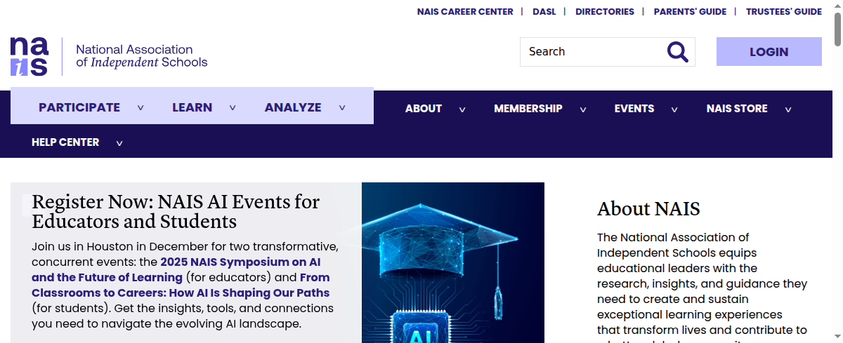NAIS supports Early Childhood, Kindergarten, Elementary, Middle School, High School independent school administrators with leadership development, policy, and advocacy. They offer research, governance guidance, and professional development for school leaders, trustees, and parents. Their resources assist with data-driven decision-making and enhancing school operations for measurable results.