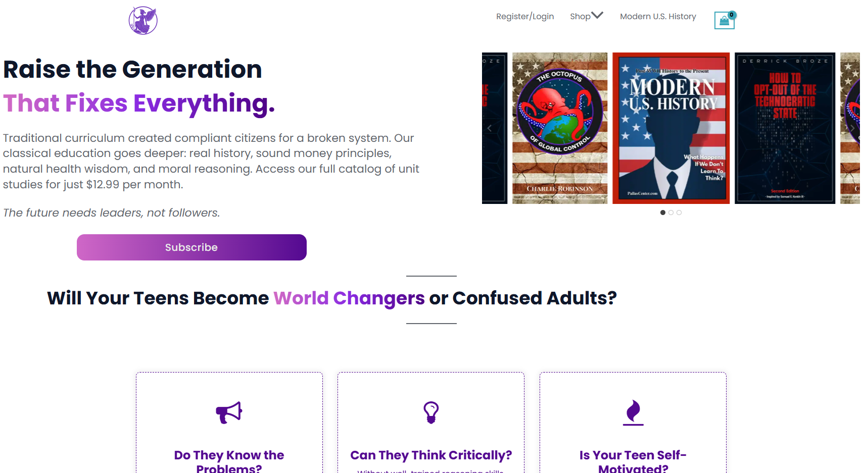 Pallas Center offers classical education curriculum designed to foster critical thinking, moral reasoning, and leadership skills. Their unit studies cover real history, sound money principles, and natural health wisdom, preparing students to be informed and engaged citizens. The curriculum includes readings, audio, quizzes, and discussion topics for both K-5 and teenage learners.