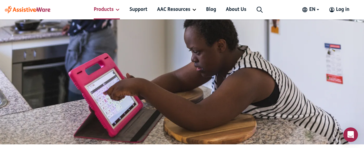 Proloquo2Go is an iOS app providing augmentative and alternative communication (AAC) for nonverbal learners. It uses symbol-based communication to help individuals, especially those with autism, express themselves. AssistiveWare also offers resources and best practices to support AAC users and their families.