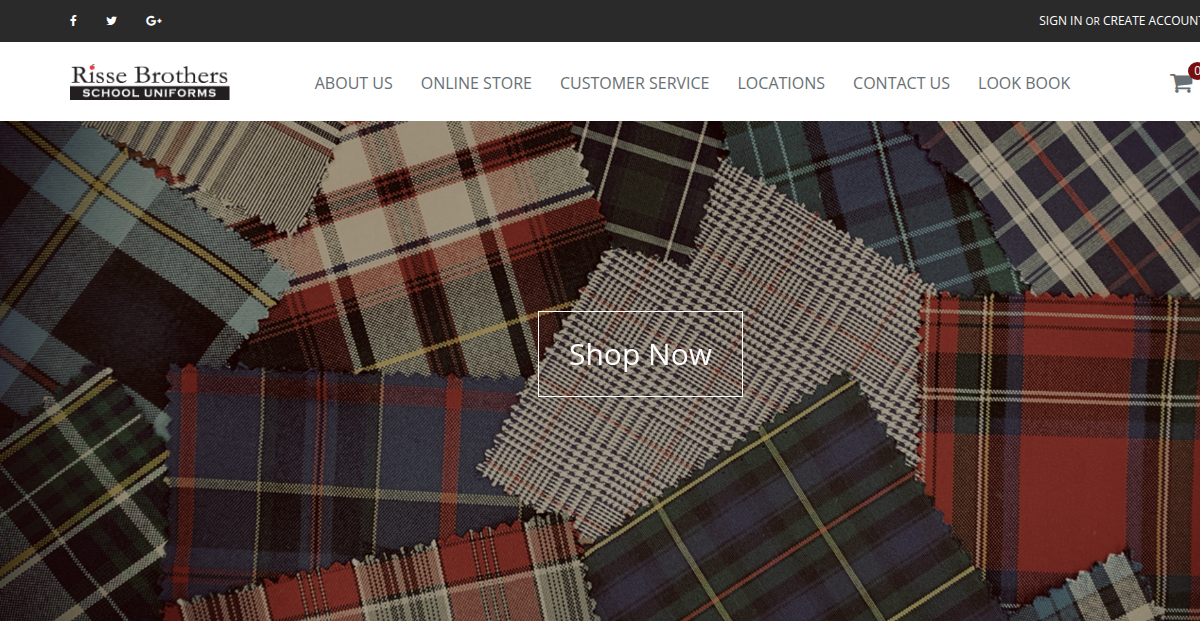 Risse Brothers School Uniforms Sign in or Create account Toggle navigation 0 × Black Glasses 1 x $400.00 × Black Glasses 1 x $400.00 × Black Glasses 1 x $400.00 Subtotal $1200.00 View Cart Checkout About Us Online Store Customer Service Locations Contact Us Look Book × Shop as a Guest State California Delaware District of Columbia Florida Indiana Maryland Michigan Minnesota New Jersey New York Ohio Pennsylvania Texas Virginia School Gender Boy Girl Grade This school requires an access code to purchase uniforms. Verify Submit Cancel × Sign in to Your Account Sign in to Your Account Forgot your password? Log in Don’t have account yet? Learn more and create an account . Shop Now Returning Customers Sign In New Customers Create Account Our Locations Our stores are stocked with your school’s merchandise so you can shop and leave with your purchase that day. Find a Risse Brothers Store About Risse Brothers School Uniforms We are proud to offer top-quality merchandise coupled with the best customer service in the industry. Risse Brothers is your best source for school uniforms. Learn More Email: cu*************@***********rs.com Our Site About Us Online Store Customer Service Locations Your Account Contact Us Careers Privacy Policy Copyright ©2018 Risse Brothers School Uniforms, Inc. All rights reserved. risseStore…