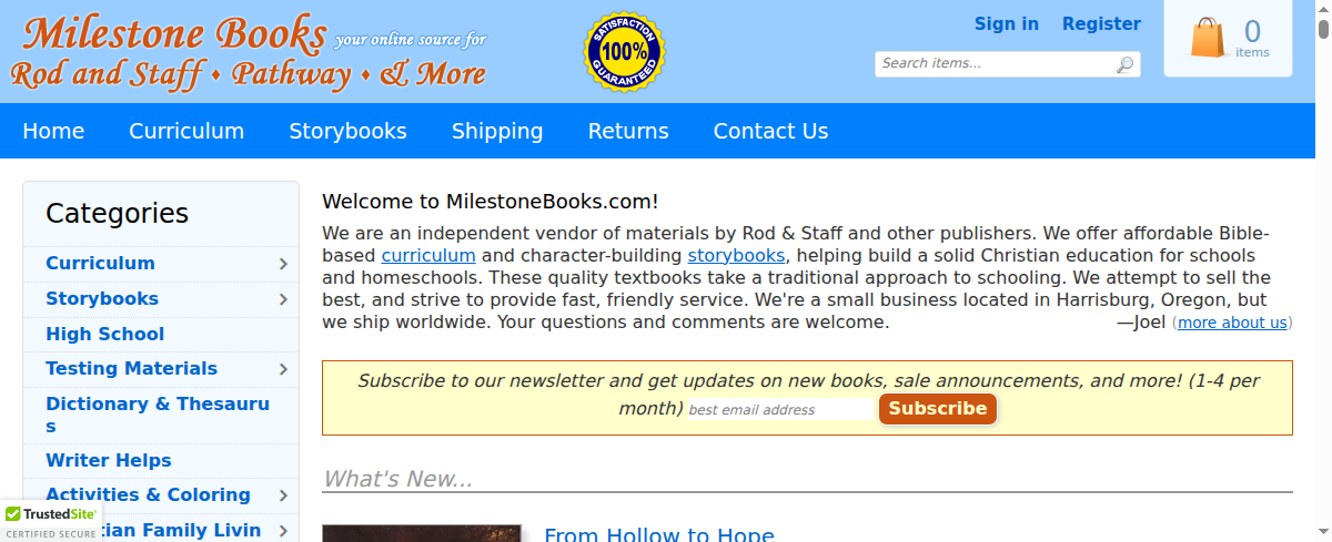 Rod And Staff Books, operating as Milestone Books, offers a comprehensive Christian-based homeschool curriculum for Early Childhood, Kindergarten, Elementary, Middle School, High School. They provide full curriculum programs, textbooks, and educational materials across core subjects like ELA, Math, Science, and Social Studies, supporting families in their home education journey.