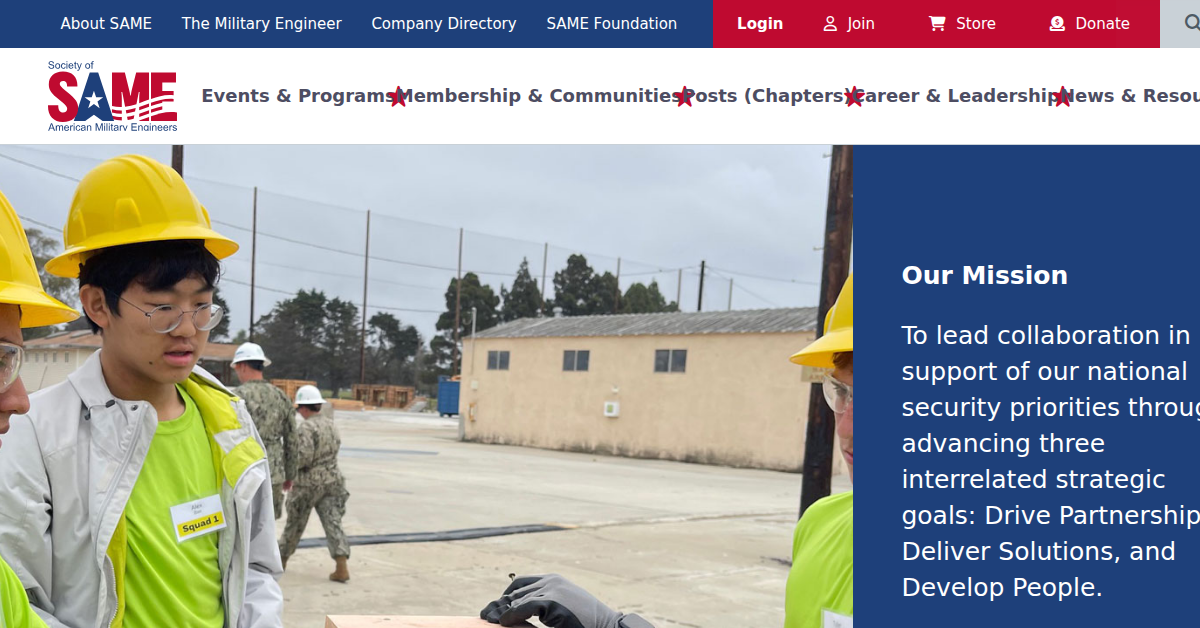 SAME, the Society of American Military Engineers, is dedicated to fostering collaboration to support national security priorities. Its mission revolves around three strategic goals: driving partnerships, delivering solutions, and developing people. SAME serves a diverse community, including learners of all ages, educators, and professionals in the engineering and construction fields, focusing on the enhancement of skills and knowledge crucial for national security and infrastructure development.