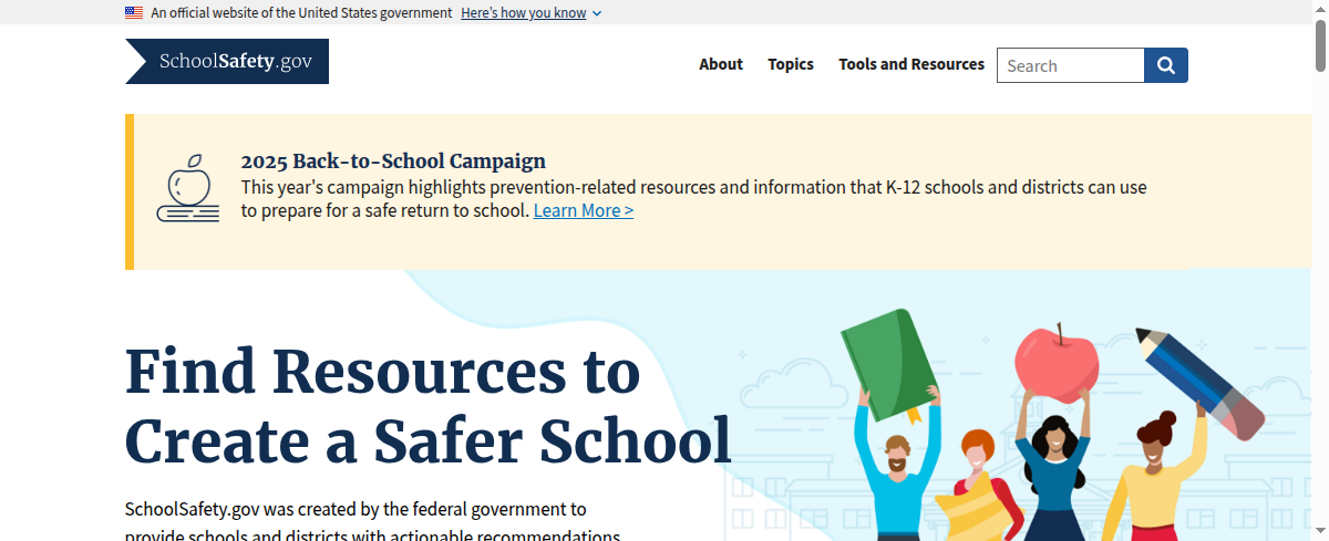 SchoolSafety.gov is a federal hub providing Early Childhood, Kindergarten, Elementary, Middle School, High School education administrators with essential resources for safety planning, emergency preparedness, and security best practices. It offers guidance, toolkits, grants information, and assessment tools to help school and district leaders create safe learning environments and make data-driven decisions.
