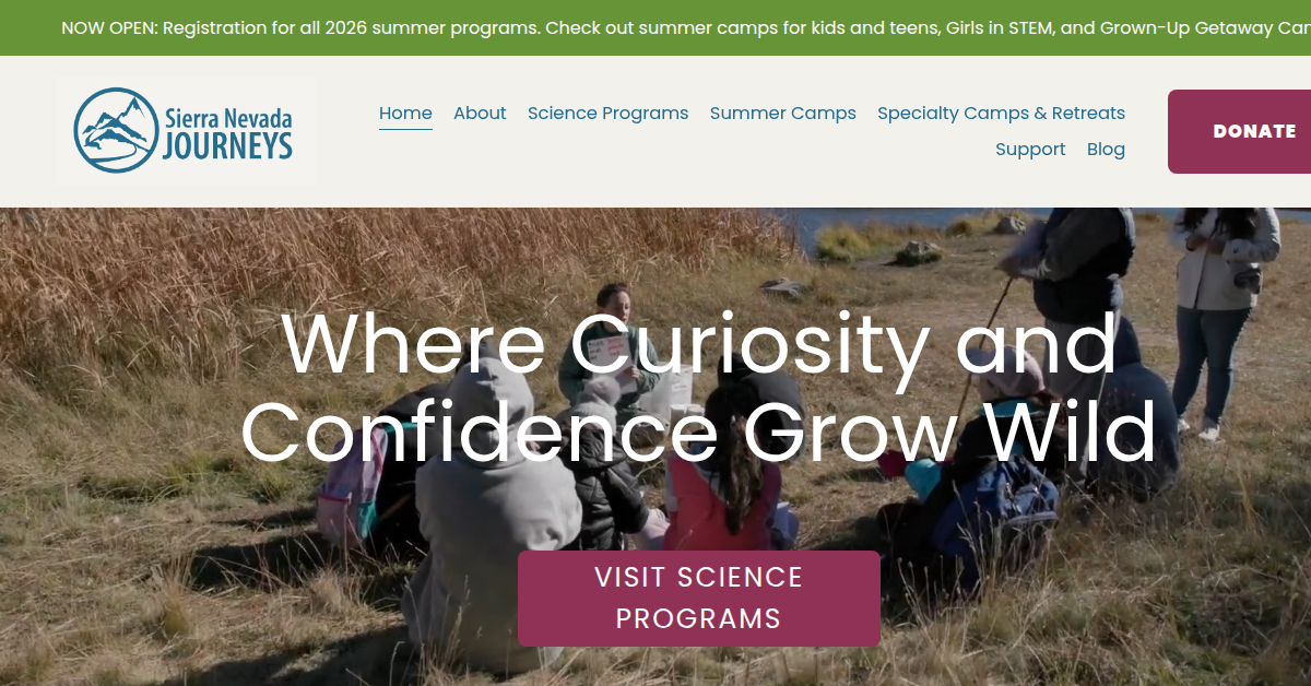 Sierra Nevada Journeys provides science-based outdoor education and STEM programs for K-12 students. Offerings include overnight outdoor learning, family STEM nights, out-of-school time learning, and summer camps, fostering critical thinking and natural resource stewardship through hands-on experiences. They focus on engaging youth in science and environmental education.