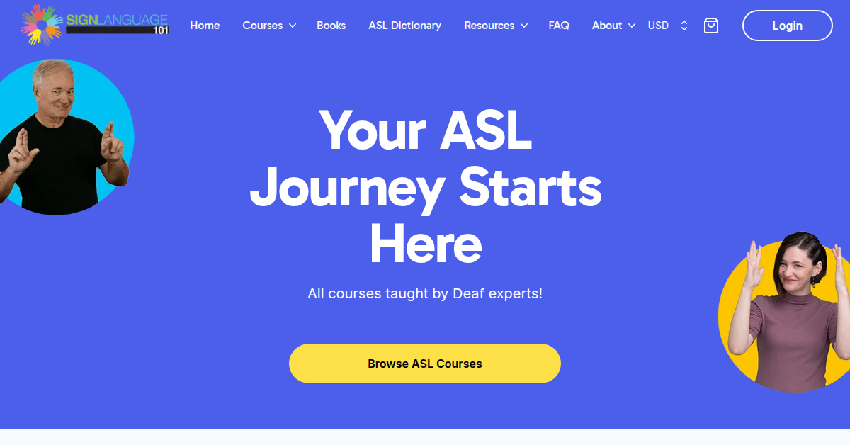 Sign Language 101 offers online American Sign Language (ASL) courses for Early Childhood, Kindergarten, Elementary and levels, taught by Deaf language experts. Accessible via web and mobile app, the platform provides flexible, self-paced learning, including specific courses for children. It also delves into Deaf culture and ASL history.