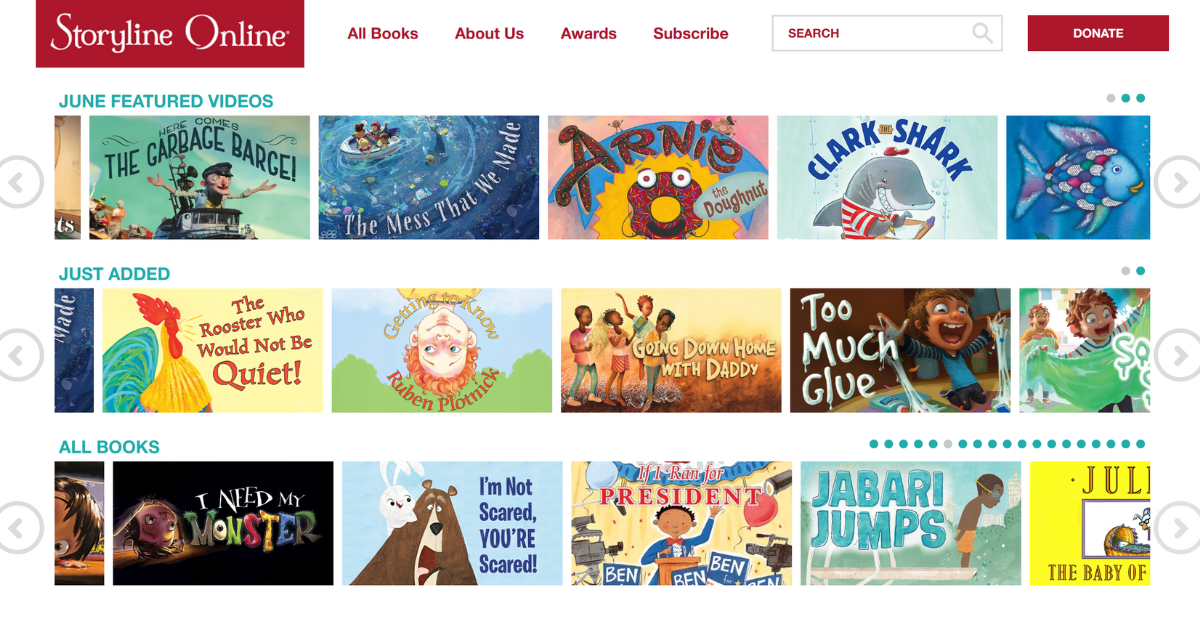 Storyline Online streams videos of celebrated actors reading children’s books, enhancing literacy and inspiring a love for reading. Each video includes supplemental curriculum, developed by elementary educators, to strengthen comprehension and verbal skills, especially for English-language learners. It’s available 24/7 for children, parents, caregivers, and educators worldwide.